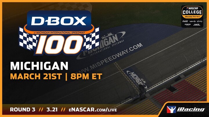The eNASCAR College iRacing Series Powered by NACE Starleague continues its third semester with a trip to Michigan International Speedway for the DBOX 100, the third of four rounds in the campaign.