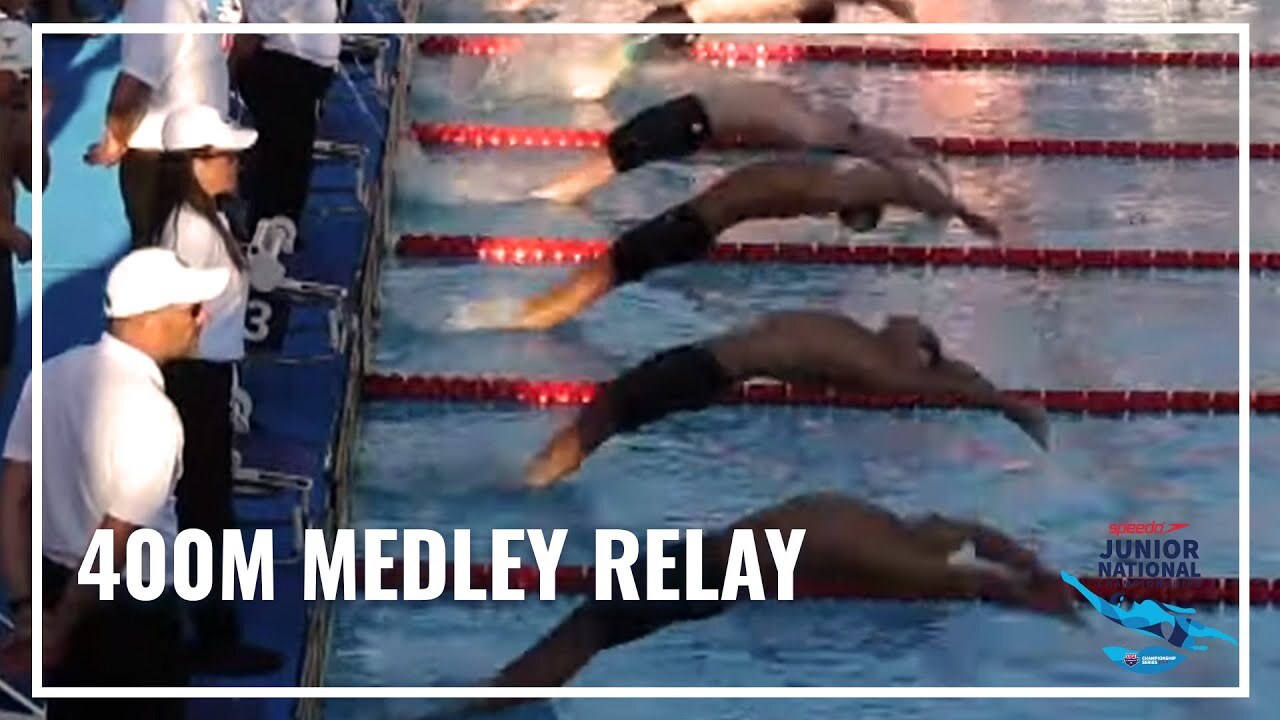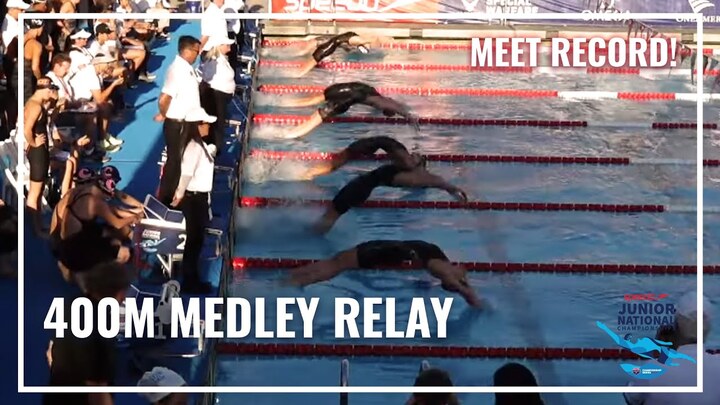 Aquajets Swim Team wins Men's 400M Medley Relay at the 2023 Speedo Junior National Championships in Irvine. Bolles School Sharks and Foothills Swim Team take second and third.