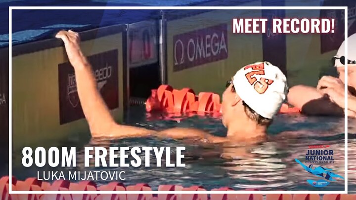 Luka Mijatovic wins Men's 800M Freestyle at the 2023 Speedo Junior National Championships in Irvine. Nathan Szobota and Aiden Hammer take second and third.