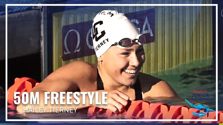 Hailey Tierney wins Women's 50M Freestyle at the 2023 Speedo Junior National Championships in Irvine. Caroline Larsen and Alex Shackell take second and third.